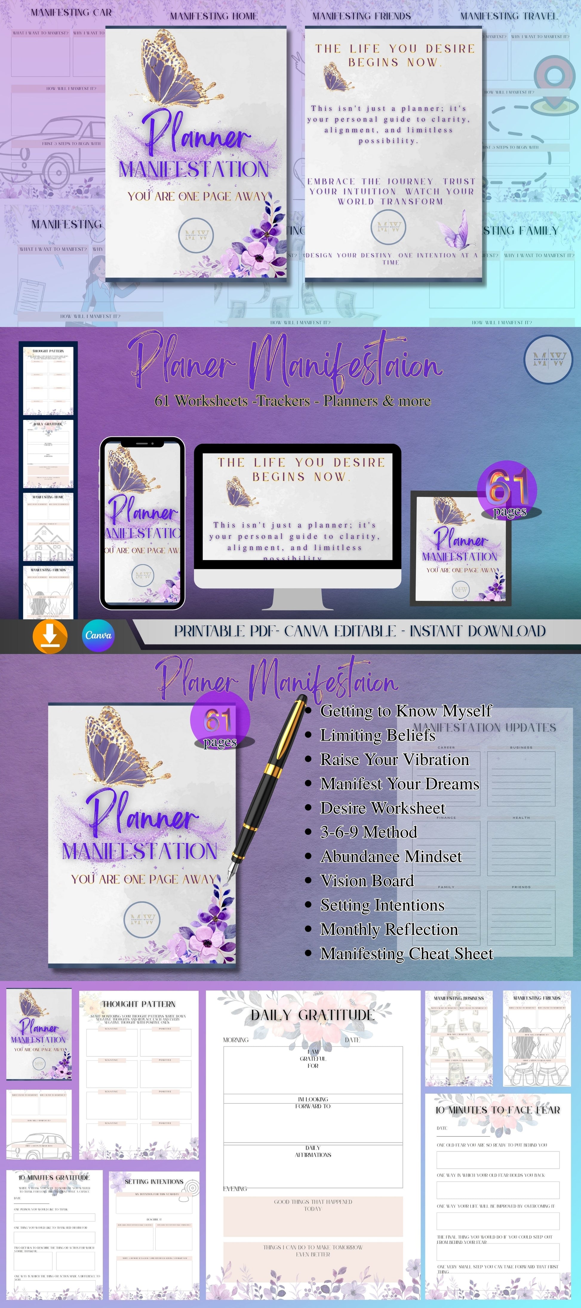 Ready to turn your biggest dreams into a tangible reality? Introducing the ultimate Manifestation Planner, meticulously designed to guide you through every step of conscious creation. This isn't just another planner; it's your blueprint for clarity, alignment, and limitless possibility. Best of all, it's a fully editable Canva template, so you can truly make it your own.